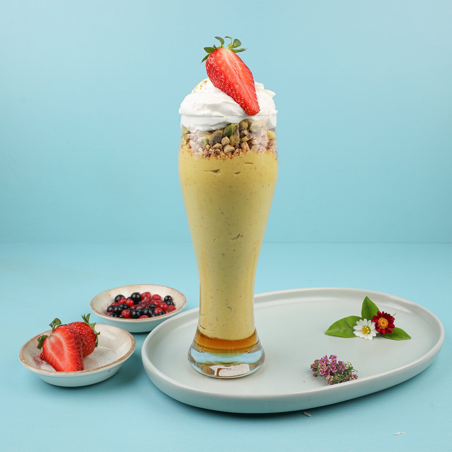 מנגו, בננה, פירות יער, גלידת וניל, דבש, חלב, מתיקות, פירות, שמנת.