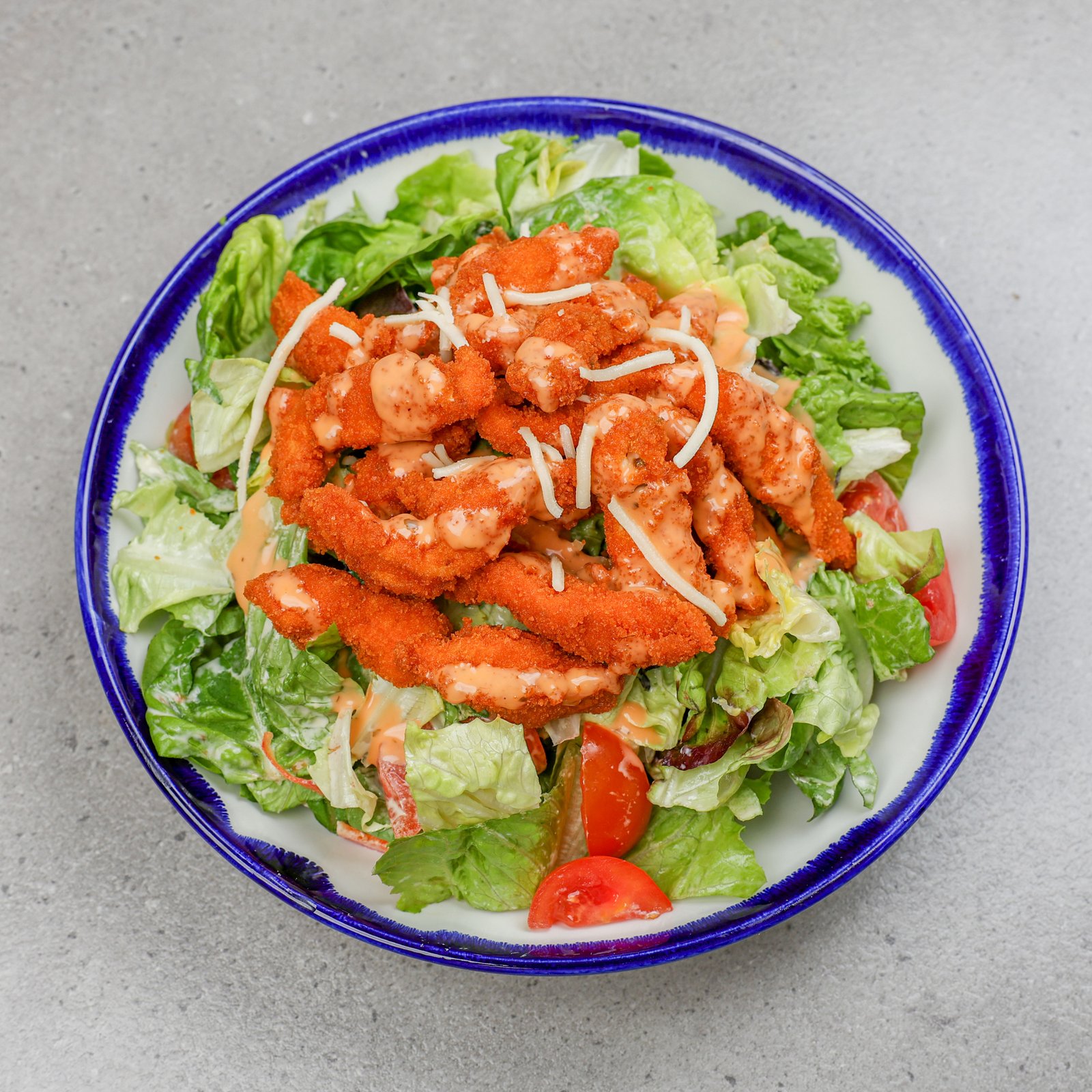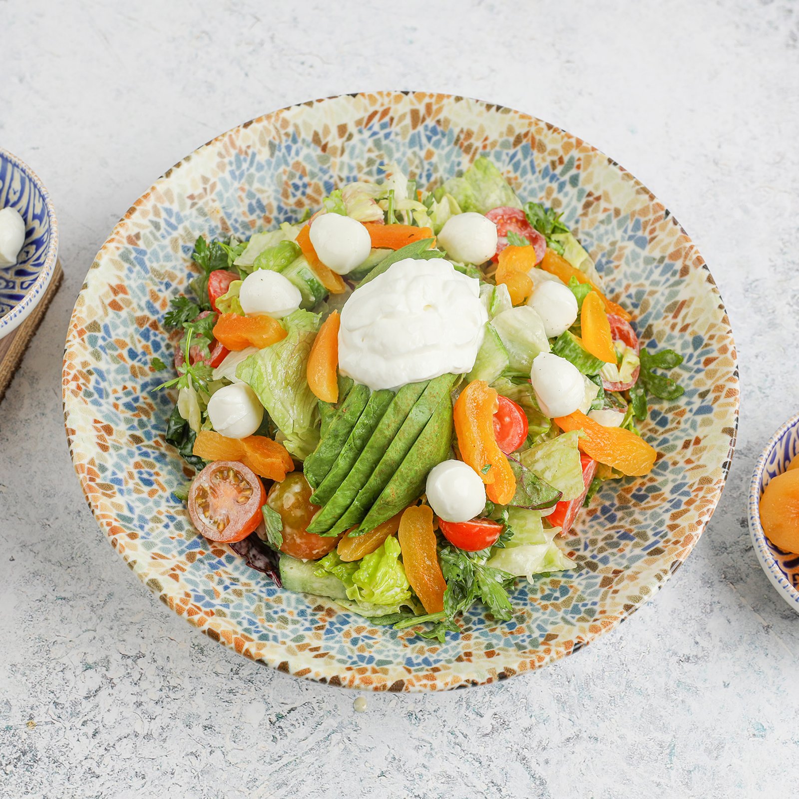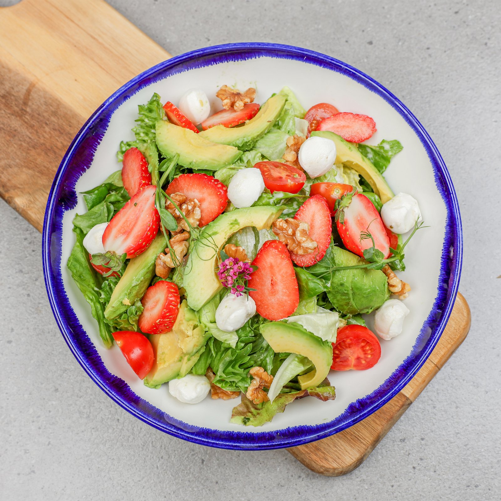 بندورة، خيار، خس، بقدونس، نعنع، توست اجبان ( جبنة فيتا، موتسريلا، جبنة صفراء) بيستو وزعتر